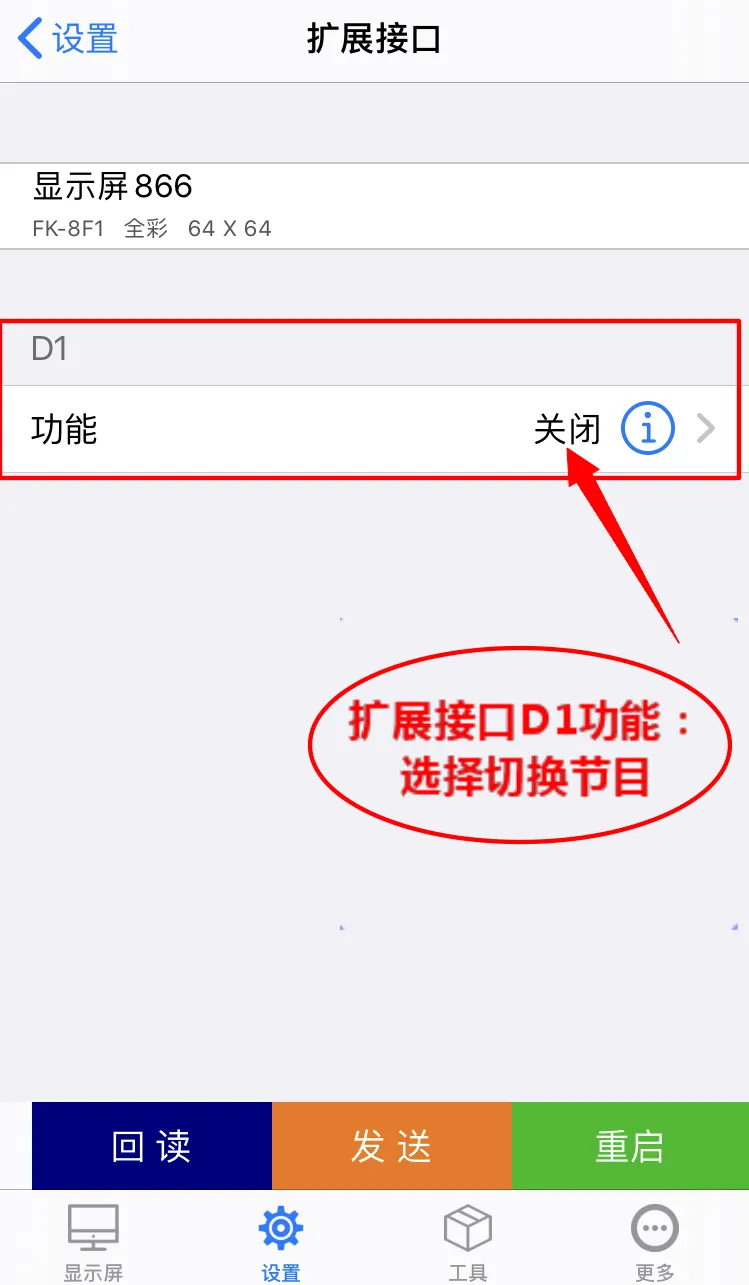 (4).选择切换节目后,点击发送,再重启;此时外置接口按钮切换节目设置成功。若要关闭此功能,选择关闭,发送,再重启即可,如(图4)。