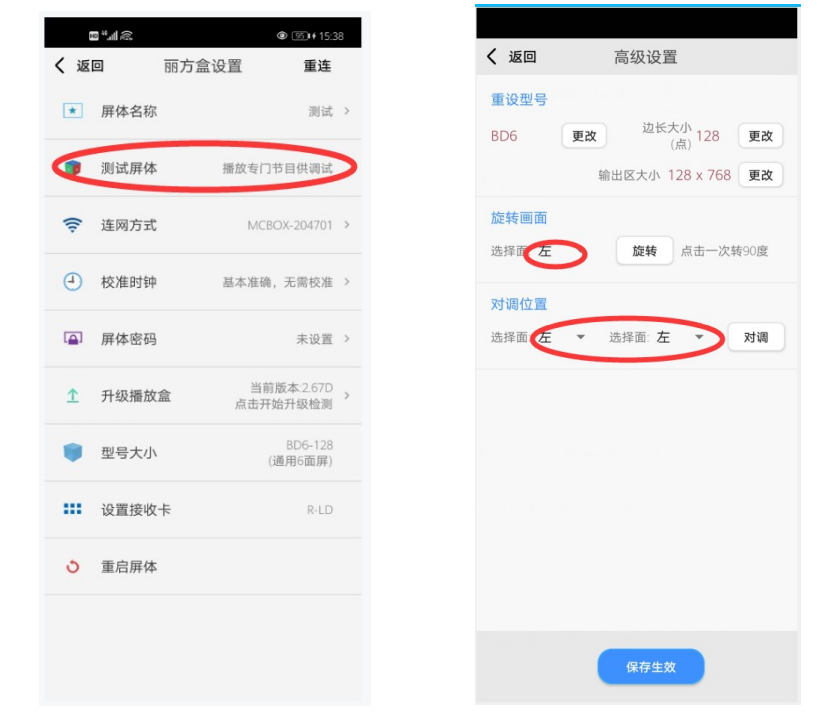 首先点击图 6 中的测试屏体,显示上下左右前后的标准画面,取一个标准面,在图 6 点击设置 进入图 8 设置,每设置一次保存一次。上下左右前后每个面显示正常之后才算是调试完成。