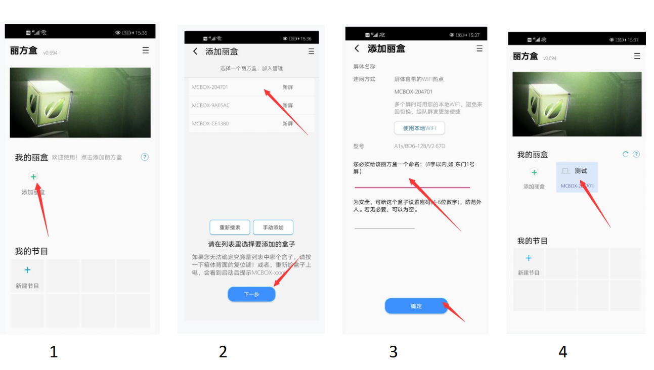 下载丽方盒 app 安装。需要给与存储网络等权限。待盒子红灯绿灯都亮后手机连接盒子 WiFi, WiFi 名字为 MCBOX-XXXX。在软件首页操作添加盒子。