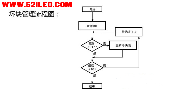鉴于闪存的写入是以页为单位操作的,操作时可能影响到整个块里其它页的数据,所以当状态寄存器发现写入出现错误时,坏块管理程序就能够用好的块替换这个坏块,重新在新的好块里写入这个数据,并把检测到的坏块里其余的有效页数据全部复制到新的块里去,标记老的块为坏块,更新坏块表里的地址,把原本坏块的地址重新映射到新的好块里。(坏块管理流程见下图)