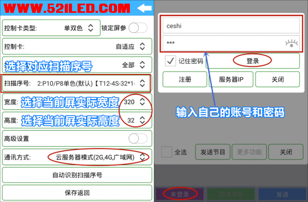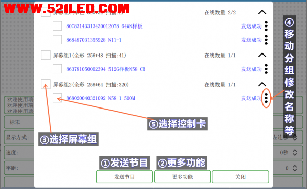 功能介绍4G(分组模式) 4G登录窗口功能介绍,如下图;①发送节目:选中控制卡、选择对应显示屏后点击“发送节目”即可;②更多功能:支持添加控制卡、修改登录密码、查找序列号、刷新、退出登录等功能;③选择屏幕组:选择当前控制卡要发送的显示屏,即控制卡和显示屏对应关系要一致(如果需要切换选择其他显示屏,需要输入验证密码,默认账号密码)。扩展:如何添加多显示屏?可以点击软件左上角,进入显示屏节目编辑界面(具体操作请查看8.0软件功能介绍)。④移动分组修改名称等:支持查看当前控制卡的服务器节目、修改控制卡名称、读取控制卡型号和版本、读取模块配置信息、设置控制卡ip、设置心跳周期、删除控制卡、升级DTU模块等功能;⑤选择控制卡:打钩选中需要发送的控制卡,支持全选群发功能。