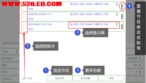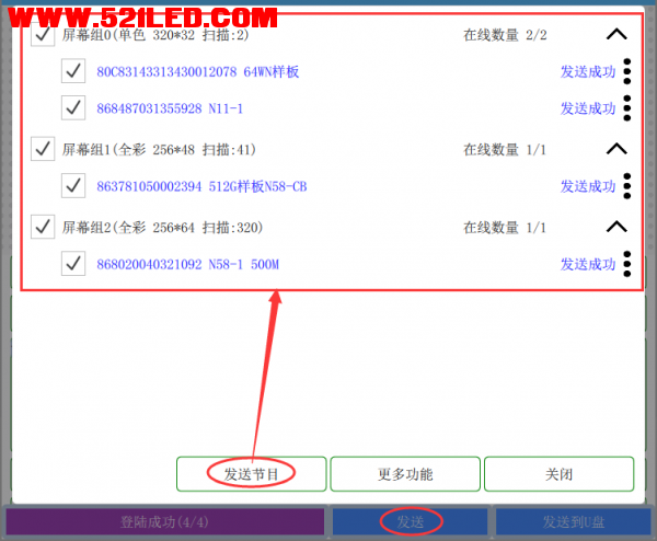 点击右下角“发送”,打钩选中要发送的“屏幕组”、选择对应的控制卡,点击“发送节目”即可,如下图。 支持单个发送、多选发送,也可以点击“更多功能”切换到“经典群发模式”。
