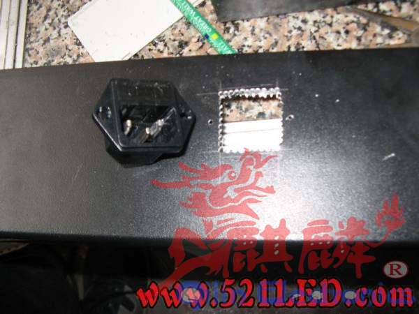 找到型材的短边,首先我们做电源的接线端子和串口的接线端子,我想你们也不希望自己的条屏拖条尾巴吧,不过非专业和样品就不用了,太麻烦,这是成品的照片,做这个需要一把小的电摩,没有手电钻也凑合,,一根2MM的钻头,要好的,长期用呢,找到电源端子,和串口座,先在铝材上画上记号,然后再用钻头沿轮廓一点一点的打眼,越密集越好,打好后用小锉刀修正,记住,我们做的是形象。。打孔时的照片,