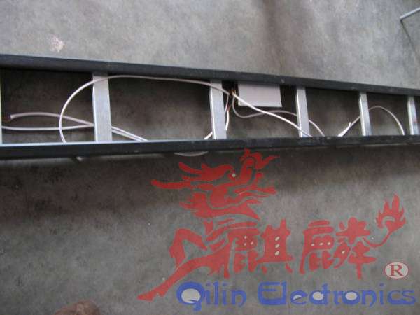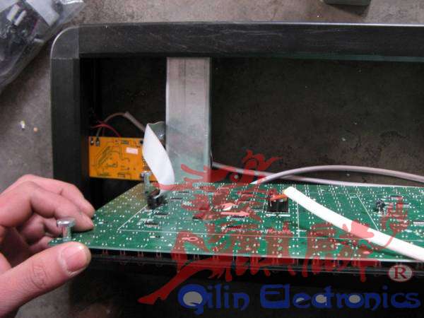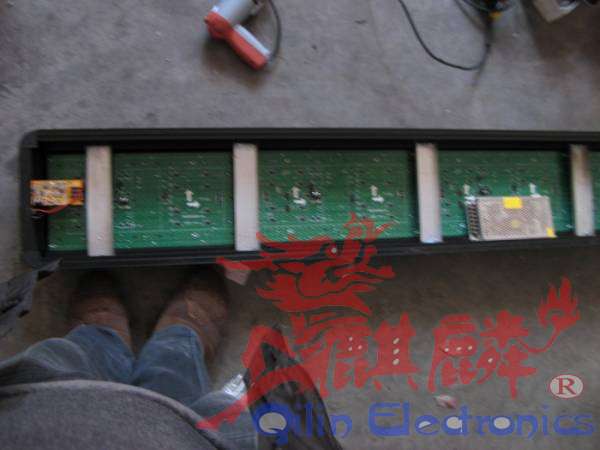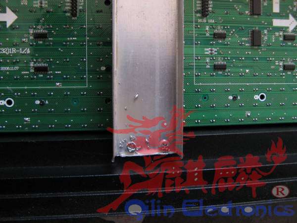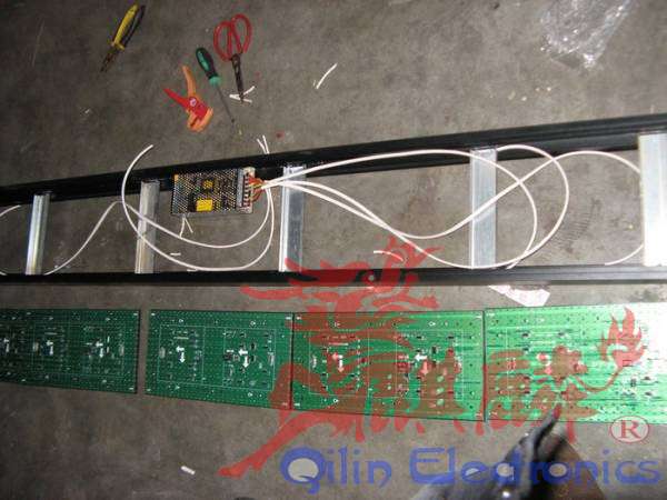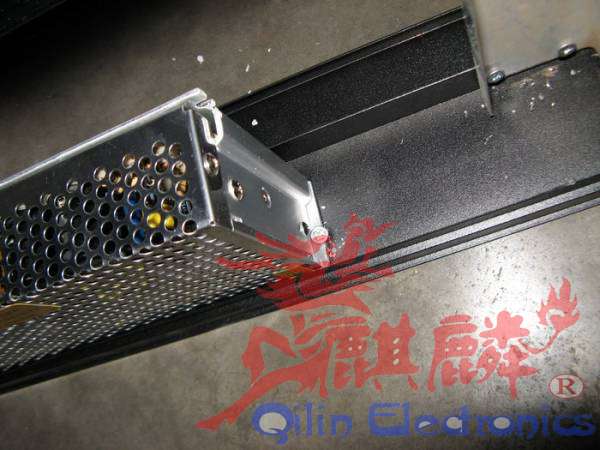 电源上面写这他的功率,最长用的是40安200瓦的电源,上面有三个COM三个+V,每一对可以代3块单元板。每块单元板需要4安得电流【全功率工作的时候】,但我们不能用满,那样会造成电源长时间工作过热,影响稳定 。电源要上在边框上,具体位置大家根据你的单元板具体布置,电源两边各有一个螺丝孔,后面的是通孔,前面的是死孔,用自攻丝固定在边框上,