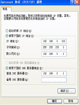 在路由器的虚拟服务器设置端口映射,如果你的本地计算机IP是192.168.0.105如图设置,给它分配端口5005.激活,执行保存即可. 路由器有各种型号,设置方式也各不相同,如果不知道如何设置,可在网上搜索设置方式. 3) 打开本地连接,属性,双击”TCP/IP协议”,选择使用下列IP地址.进行设置.(不要自动获取)
